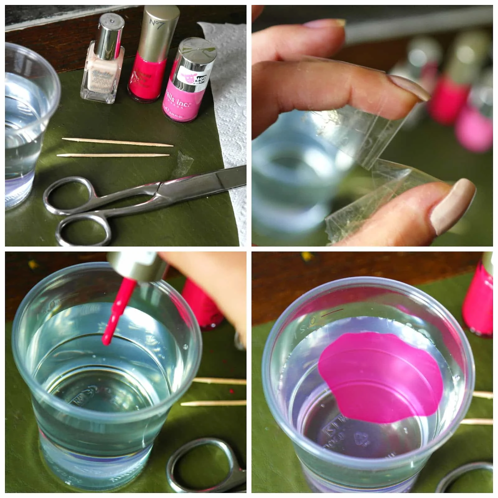 You can create a quick and easy marble effect in your nails by using a bowl of water, nail polish, toothpick and petroleum jelly. Take a bowl and fill it with water halfway. Pick some nail polish colors and take a few drops and place them in the water. Repeat this with all your nail polish choices. When you have placed all your colors take your toothpick and manipulate it your designed marble design. When you get your ideal pattern rub petroleum jelly around the finger away from the nail, secure the skin around the nail with petroleum. Dip your nail palms up in the marble design and leave it for 3 seconds. Raise your finger and wait for a minute and wipe the excess nail polish from your skin. This nail hack trick can be messy, but the end result is worth it. Repeat these steps in all of your fingernails.